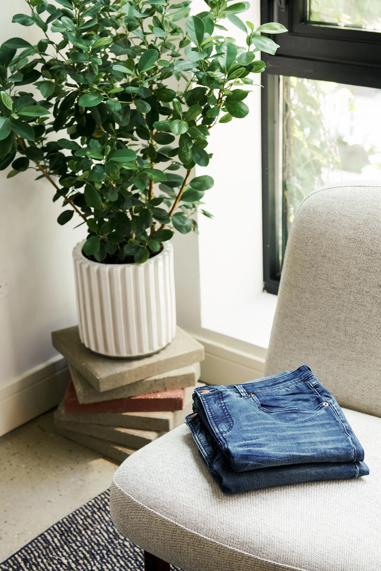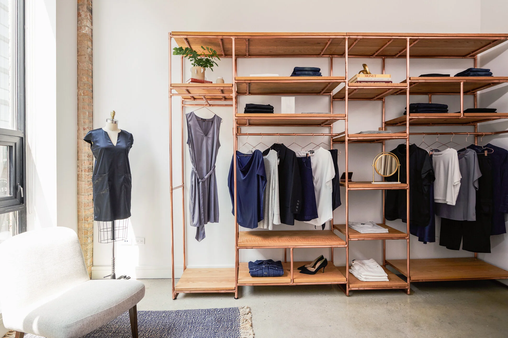 As part of the brands past experiences, copper became that material for the brands physical identity. To develop this material into a flexible material, Grayscale designed and fabricated a series of fixtures to be used in differing ways. For each fitting room the copper material was combined with a red oak wood stained with natural oils to create a series of wardrobe fixtures that could be used to display varying sizes of hanging product, folded product, and decor elements to create a welcoming environment. In the Showroom where more clothing needed to be displayed, a series of folded and hanging fixtures were designed to allow browsing of featured product. And lastly, throughout the home, a series of display fixtures were used to showcase the brand in a more artistic style, hanging from above or leaning against the wall to minimally divide the space up.
